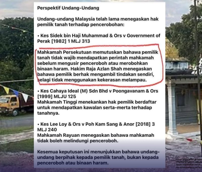 Menurutnya, beberapa keputusan mahkamah telah lama memperincikan bahawa undang-undang Malaysia berpihak kepada pemilik tanah dalam isu pencerobohan dan binaan haram.